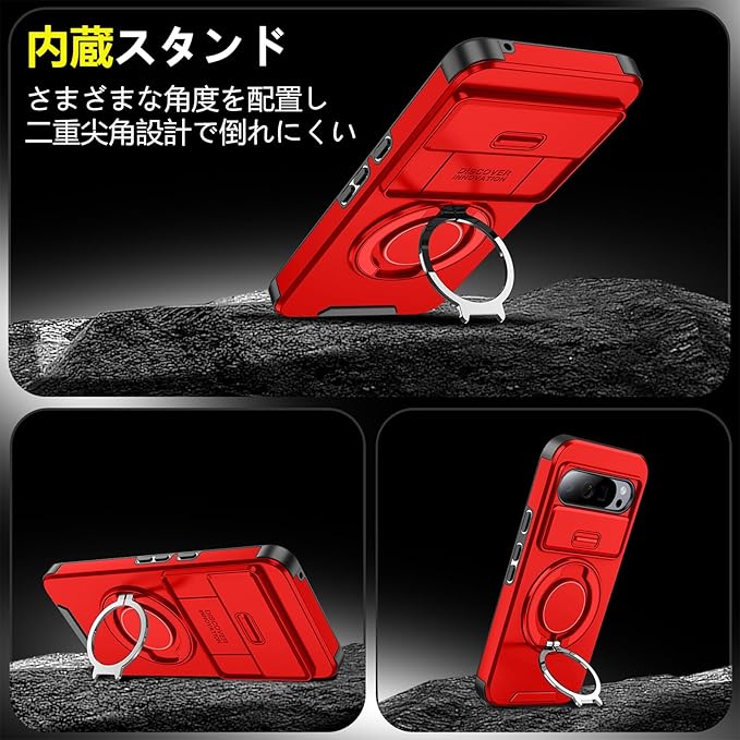 対応 Google Pixel 9 用 Pixel 9 Pro 用 ケース スタンド付き 耐衝撃 レンズ保護 スライドカメラカバー TPU+PC 軽量 滑り止め 落下保護 スタンド機能 車載ホルダー対応 ピクセル 9/ピクセル 9 Pro 携帯ケース 赤 R-LK-Pixel9-9Pro-03