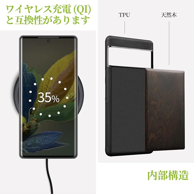 「製品構成」軽量で保護機能を兼ね備えた木製のスマホケースです。合成木と高品質のソフト TPU(熱可塑性ポリウレタン)をベースに作られており、美しい外観だけでなく、保護機能も優れています。美しい木目が個性を際立たせます。製品を受け取った時、その独特で自然な美しさを感じることができます。