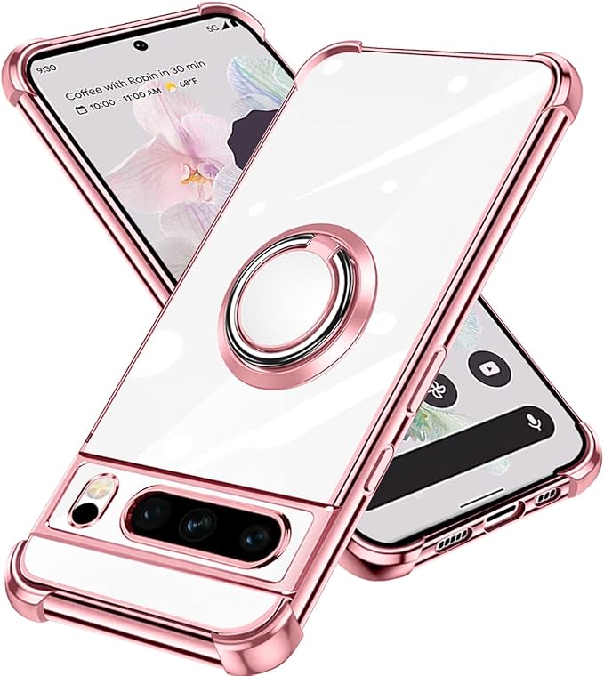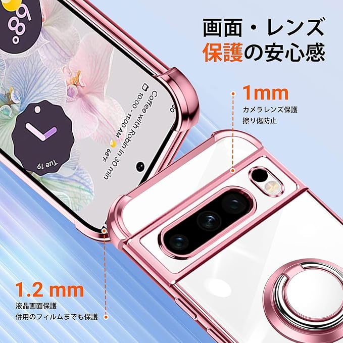 Google pixel 8 pro ケース クリア リング付き 耐衝撃 柔軟 軽量TPU 透明 薄型 レンズ保護スマホ 落下防止 滑り止め、すり傷防止 360 回転 スタンド機能 車載ホルダー対応(ローズゴールド)