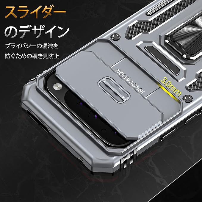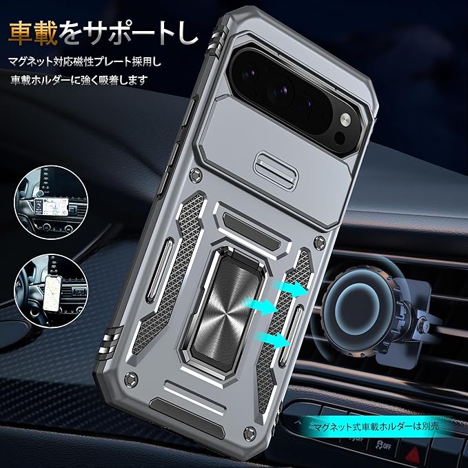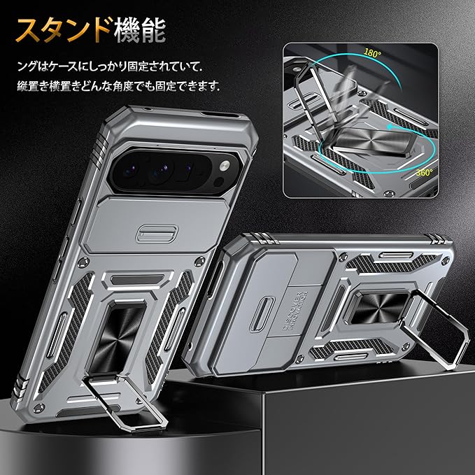 【機種対応】対応 Pixel 9 Pro XL 6.8インチ Pro 用のデザインです、他用の機器と互換性がない。【二重構造】PC(ポリカーボネート)バック+TPU(シリコン)バンパー+金属ホールリング、内側TPU素材とハードPCフレームで制作するため、耐久性に優れた、外部からの衝撃を内部に吸収されて、側に滑り止めの設計で、落下を防止にできます。全カバー式の音量ボタン&スイッチボタンの設計は、ぴったり合うだけではなく、操作しやすいよう最も適したサイズに作られています。【スライド式カメラカバー】スライドカバーはより滑らかに開閉できるようになりました。カメラレンズもスライド式カバーで砂・埃などの侵入を防ぎます。ケースのエッジは液晶画面より高さの設計で、液晶画面を保護することができます。【スタンド機能】スタンドの機能はスマホを横に放置できて、長時間の動画視聴でも手に持つ必要がなく、超らくらく動画視聴が可能です!長時間での新幹線、飛行機の中での暇つぶしに最適ですよね。携帯ケースと指リングは一体型な設計で複雑な取り付けがなく、落下しにくく、擦り傷、ぶつかり合う、落下からスマートフォンを保護することができ、手に持って持ち運ぶことも安全&便利です。車載の磁気吸盤にしっかりと吸着することができ、運転中に携帯電話のナビゲーションなどの機能をより便利に使用することができます。(ご注意:ケースの背面は金属製部分がありますので、ワイヤレスチャージャーを使うことときにカバーケースを取り外してください。USB lightning ケーブルで充電するならOKです。)【カラーバリエーション】豊富なマルチカラーラインナップ!シンプルなベーシックカラーからポップなアクセントカラーまで、あらゆるスタイルとシーンに合わせてお選びいただけます。日常の気分やお好みに合わせて、自由にコーディネートできる楽しさをご提供します。