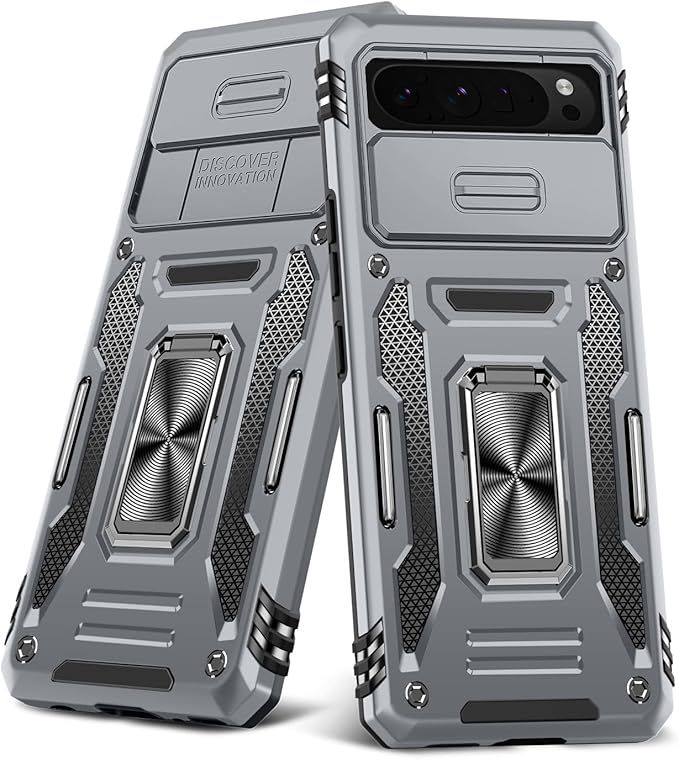 Google Pixel 9 PRO XL 対応 ケース リング付き スライド式カメラカバー 耐衝撃 スタンド機能 車載ホルダー レンズ保護 ソフト ピクセル9 プロ XL 対応 スマホケース PC TPUバンパー 防塵 人気 落下防止 滑り止め 指紋防止 携帯カバー グレー K197