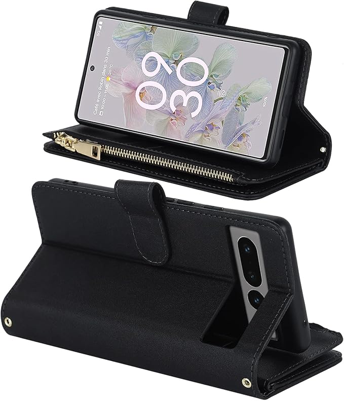 Eastwave for Google Pixel 7 Pro ケース for Pixel7 Pro 縄掛けケース 手帳型 Pixel 7pro 財布型 ICカード コインポケット ストラップ付き カード 収納 小銭入れ ファスナーポケット付き PUレザー 6色 ブラック