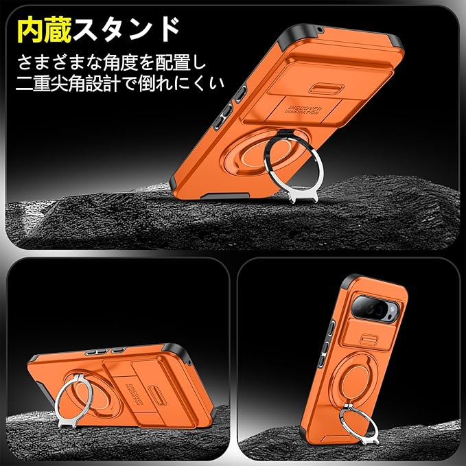 対応 Google Pixel 9 用 Pixel 9 Pro 用 ケース スタンド付き 耐衝撃 レンズ保護 スライドカメラカバー TPU+PC 軽量 滑り止め 落下保護 スタンド機能 車載ホルダー対応 ピクセル 9/ピクセル 9 Pro 携帯ケース オレンジ R-LK-Pixel9-9Pro-06-CP
