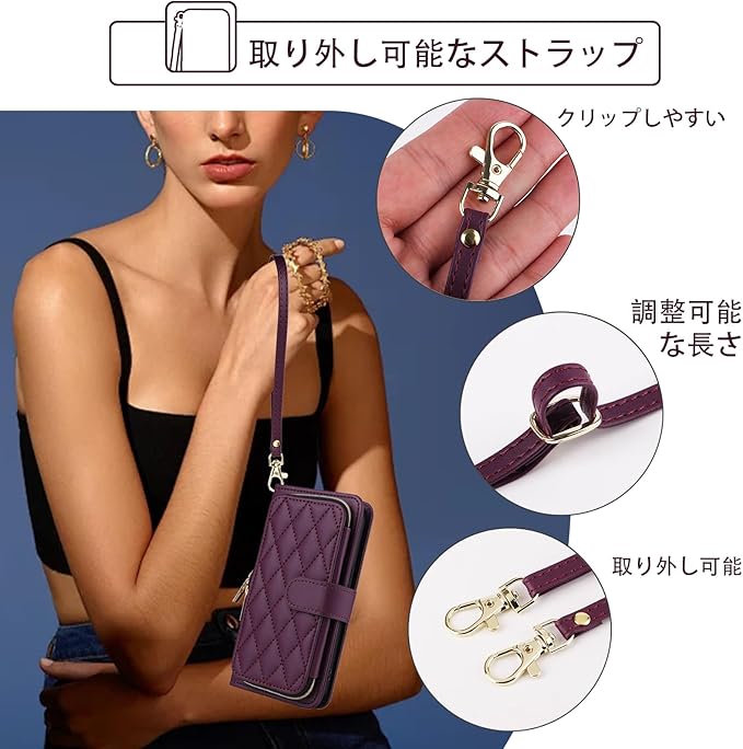 Elisorli for Google Pixel 8A 手首/ショルダーストラップ カードスロット ジッパー財布 豪華 PUレザー スタンド ための 携帯電話のカバー 持つ Pixel8A A8 5G ウォレットケース しい 大人人気 お洒落 ケース 手帳型 スマホケース カバー スマートフォン 耐久性 耐衝撃 フラップ ストラップホール カード収納 女 濃い紫