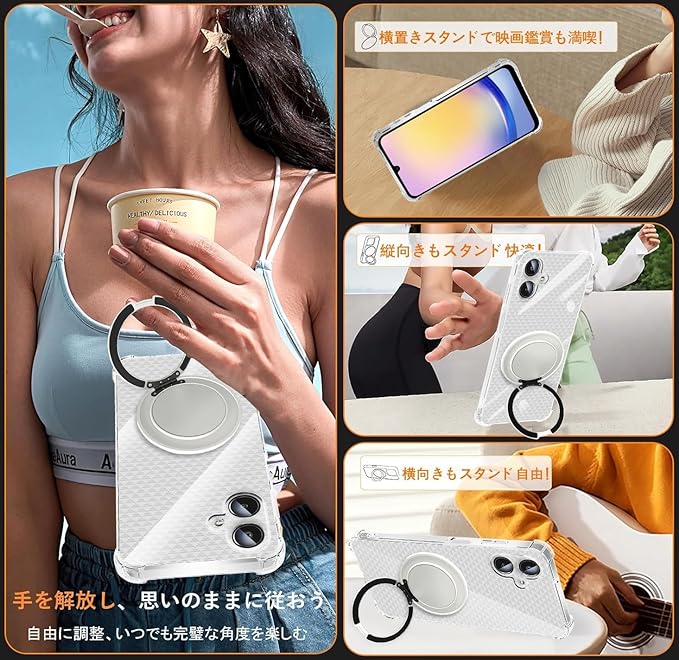 【360 回転スタンドケース ・縦も横も自由自在】固定式スタンドケースとは異なり、リング部分が360度回転します。オンライン会議や友人とビデオ通話をするときは縦置きに、ゆっくり動画を見るときは横置きにと、シチュエーションにあわせて簡単に向きが変えられます。 リング部分を回転させると「カチカチ」と心地よい音が鳴るのもおすすめポイントです。
