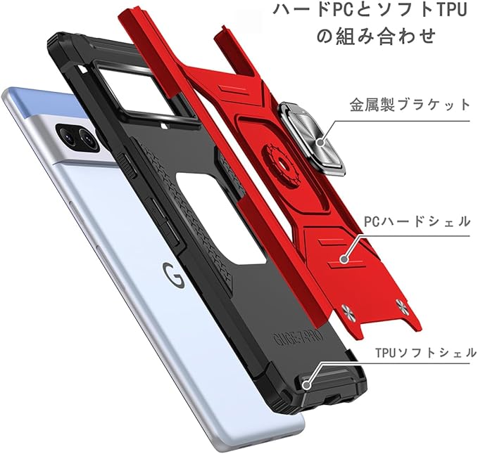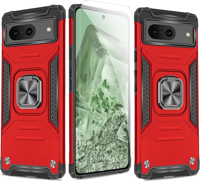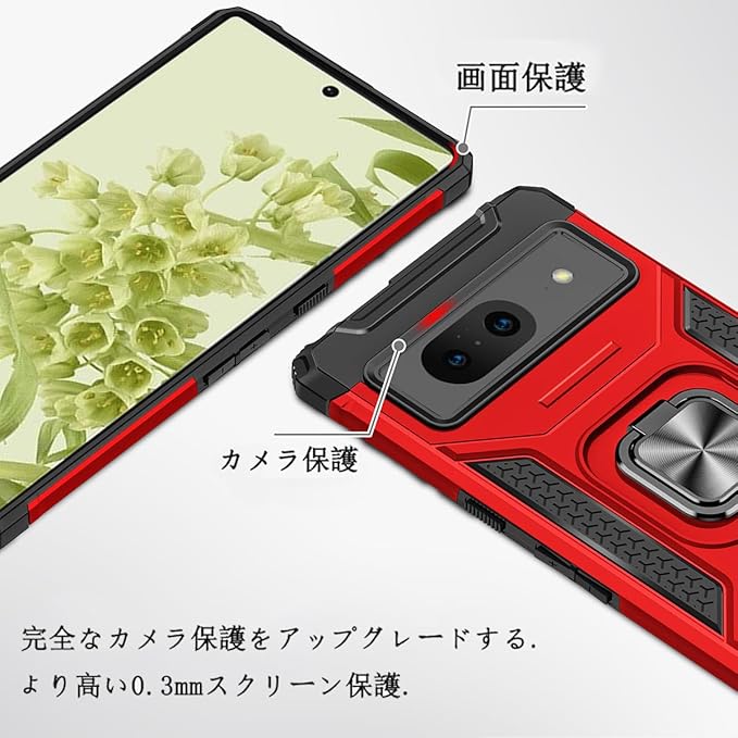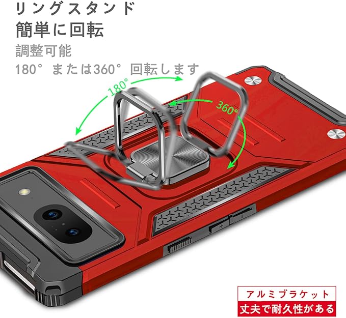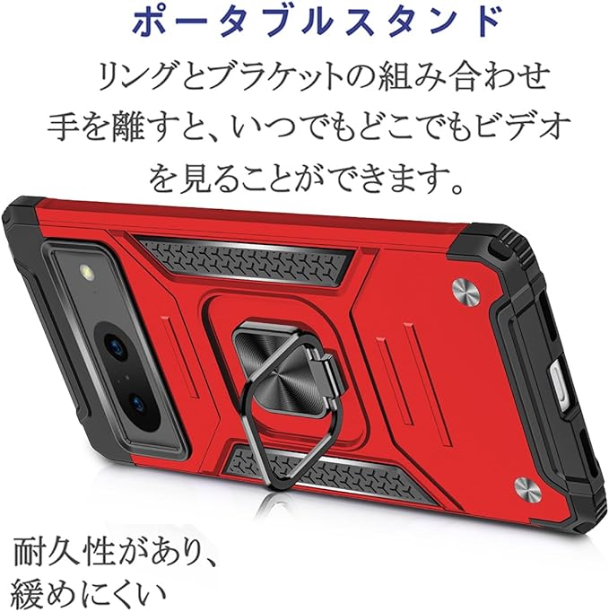 JSCOMYAP Google Pixel 8 用ケース + 强化ガラス フィルム リング付き スマホケース スタンド機能 携帯ケース 耐衝撃 横置き機能 Case Cover グーグルピクセル8 ぐーくるぴくせる8 ぴくせる8 背面 カバー メンズ 5.8インチ(赤)