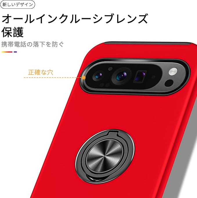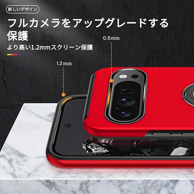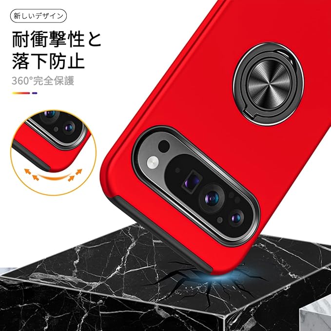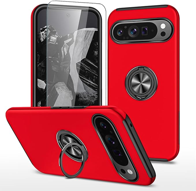 JSCOMYAP Google Pixel 9/9 Pro ケース用 + 强化 ガラスフィルム リング付き スタンド機能 携帯ケース 耐衝撃 衝撃 カバー Case Cover ピクセル9 ピクセル9pro ぐーくるぴくせる グーグルピクセル 9プロ 対応 スマホケース 背面 カバー(赤)