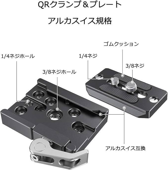 本製品はArcaタイプのクランプとプレートを組み合わせたパーツです。そのため、ほとんどのArcaタイププレートとの互換性もあります。プレートをカメラまたはケージの底に取り付けられています。