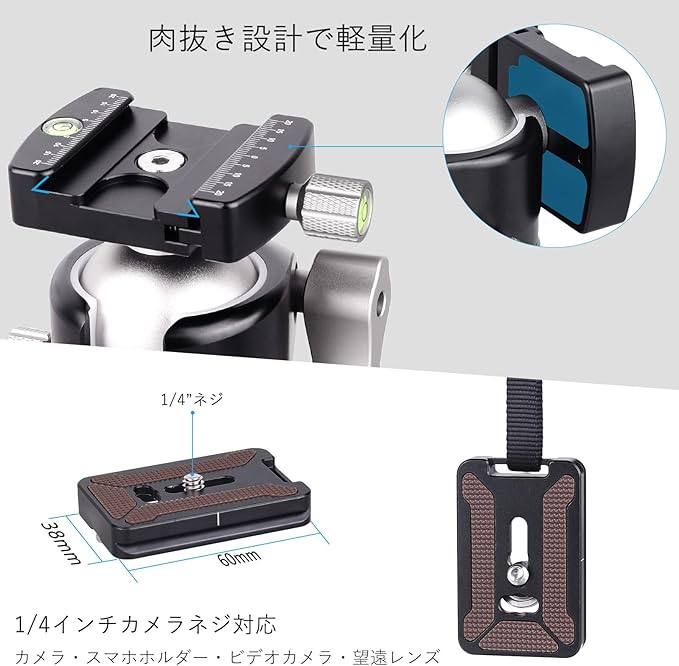【Arca-Swiss互換・高い汎用性】Arca-Swiss規格のクイックリリースプレートに対応。上部1/4インチネジ、底部3/8インチネジ穴で、ほとんどのカメラ・三脚に対応します。