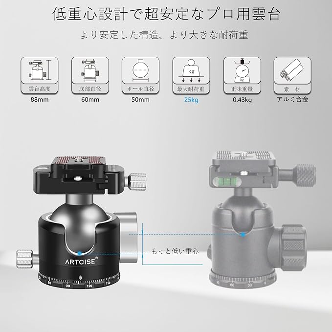 ARTCISE 50mm 低重心 ボール雲台 軽量 CNCアルミ三脚雲台 Arca-Swiss互換 クイックリリースプレート U型スロット搭載 高耐荷重 水準器付き 予備プレート付