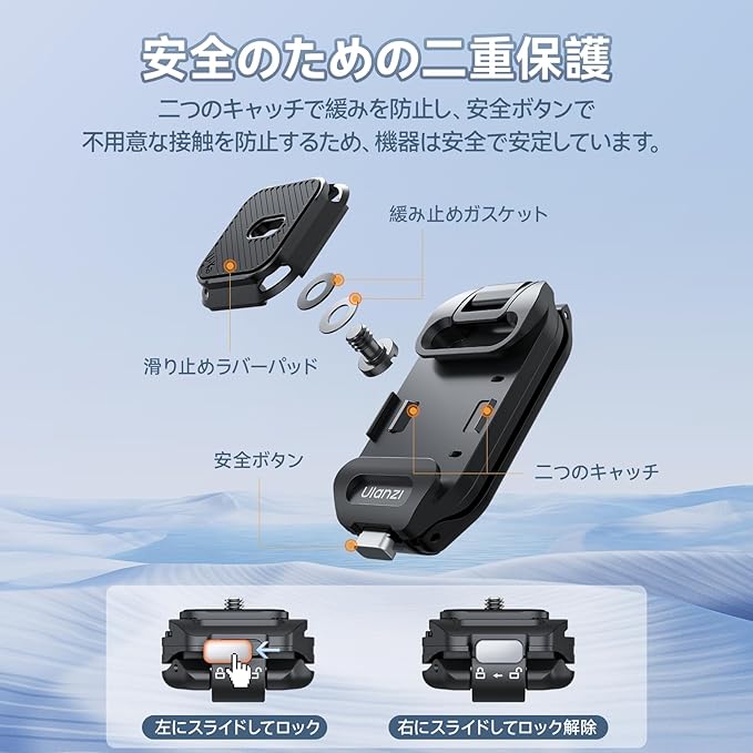 【安全構造】ステンレスガスケットとグラファイトナイロンスペーサーを追加し、ネジの緩みを効果的に防ぎ、カメラをよりしっかりと取り付けます。それに、ロック後はボタンが押せなくなり、デバイスの落下を防ぎ、使用中に比類のない安全性を提供しております。