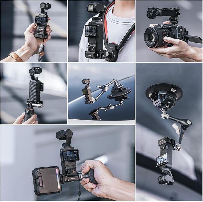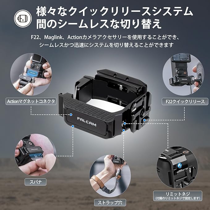 【幅広い互換性】多機能ケージには6種類のインターフェースがあります。F22クイックリリース、Actionマグネットインターフェース、アルカスイス互換、3種類のクイックリリース方式を装備。コールドシュー付き、ライトやマイクなどのアクセサリーも取り付け可能。また、サイドにはGoproのインターフェースと1/4ネジ穴があり、三脚に適応できるだけでなく、GOPRO用のほとんどのアクセサリーとを使用することができます。マグリンク・ショルダーストラップに対応ための穴も付き。