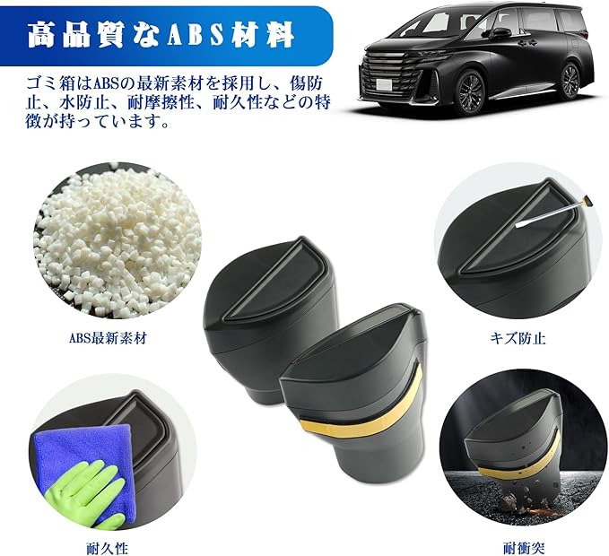 【簡単設置・水洗可能】このアルファード40系専用ゴミ箱は高品質で耐久性に優れたABS素材を使用しており、直接水洗いでき、汚れ防止でお手入れ簡単です。設置方法は非常にシンプルで、2列目のドアポケットにそのままセットするだけで、しっかり固定され走行中にもずれにくい設計です。付属の粘着シートをご利用いただくことで、より確実に設置することも可能です。