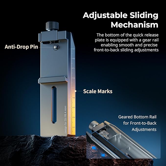 【調整可能なスライド機構】- クイックリリースプレートの底部にはギアレールが装備されており、前後方向のスムーズで正確なスライド調整が可能です。