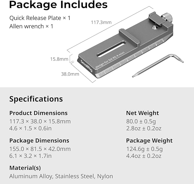 【DJI RS 4 Mini用】- RS 4 Miniに完璧にフィット:Arca-Swiss純正マウントプレート、カメラケージ、Lプレートと完全に互換性があり、RS 4 Miniスタビライザーとのシームレスな統合を実現します。ご注意:プレートの長さは4.6インチです。