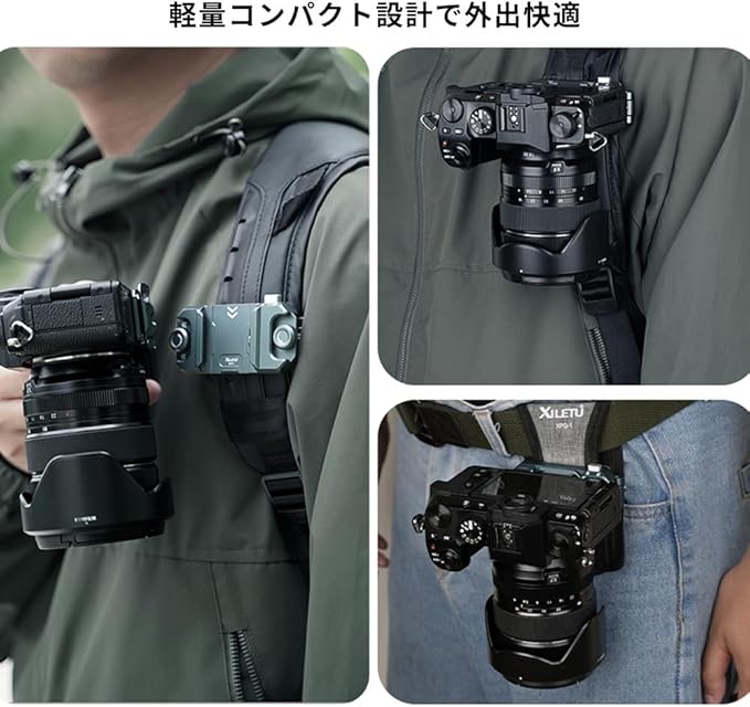 【XQD1クイックリリースシステム】:XILETUはクイックリリースシリーズを開発し、カメラとアルカスイス対応できクイックリリースプレートの装着状態で、カメラホルスターとショルダーストラップの間に、素早く切り替えることを実現します。カメラと三脚&雲台の間にクイックリリース化して脱着の手間が大きく省けます。