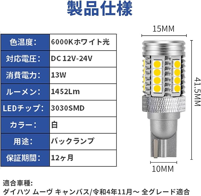 ムーヴ キャンバス 適合 バックランプ セット内容:T16 LEDバルブ 1セット(2個)
