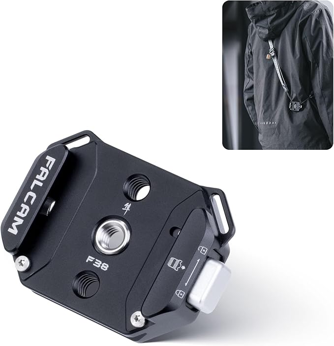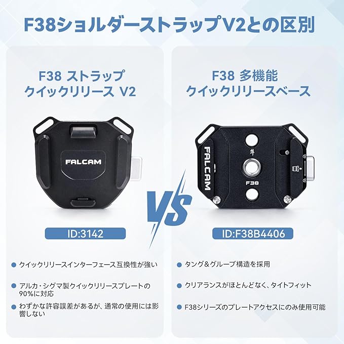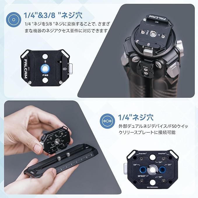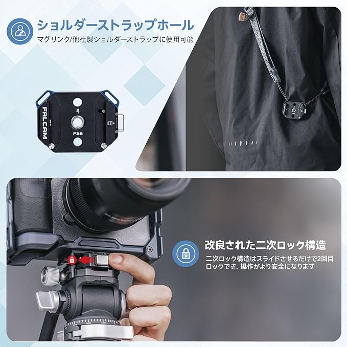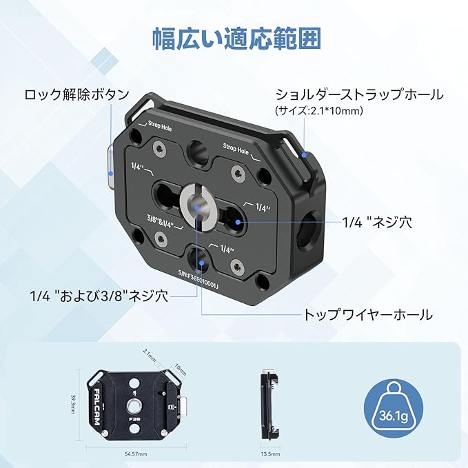 【幅広い互換性】クイックリリースベースの底部に1/4’’ネジ穴と3/8’’ネジ穴があります。クイックリリースベースはショルダーストラップに対応ため2つの穴付き。外部アライ位置決め装置/F22クイックリリースプレートに接続可能。注意:F38クイックリリースベースは、F38以外のクイックリリースプレートには使用できません。