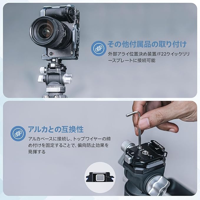 【Arca-Swiss対応互換】ベースはアルカスイス38mm標準が付属しており、アルカスイス互換の雲台側パーツ(クランプ)にセットすることができます。アルカベースに接続し、トップワイヤーの締め付けを固定することで、偏向防止効果を発揮します。