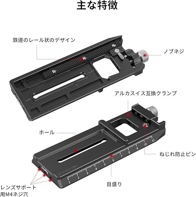 【アルカスイス互換】クイックリリースプレートにアルカスイス規格のクランプがありますので、ノブネジを使って、アルカスイス規格のプレートを素早く取り付けられます。そして、 アルカスイス規格のクランプの内側には脱落防止設計を採用し、機材を落下からしっかり守ります。