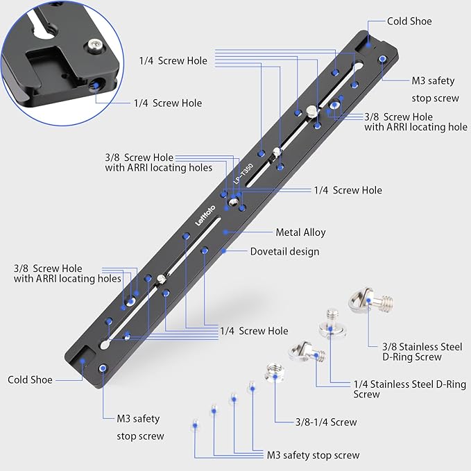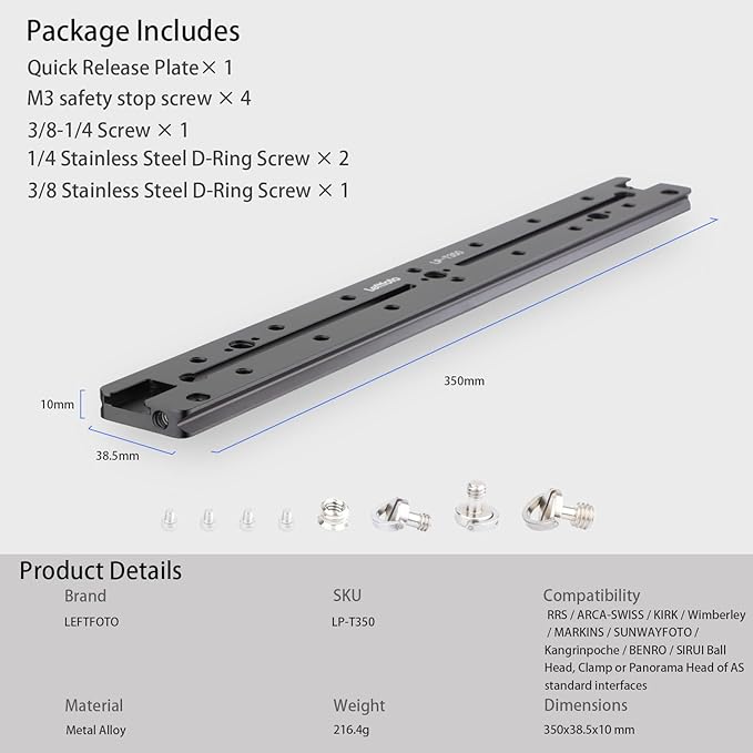 LEFTFOTO 350mmダブルダブテールスライドレール、アルカスイスクイックリリースプレートARRI用位置決め穴付き、1/4 "および3/8 "ネジ、コールドシュー デジタル一眼レフカメラ用三脚ボールヘッド