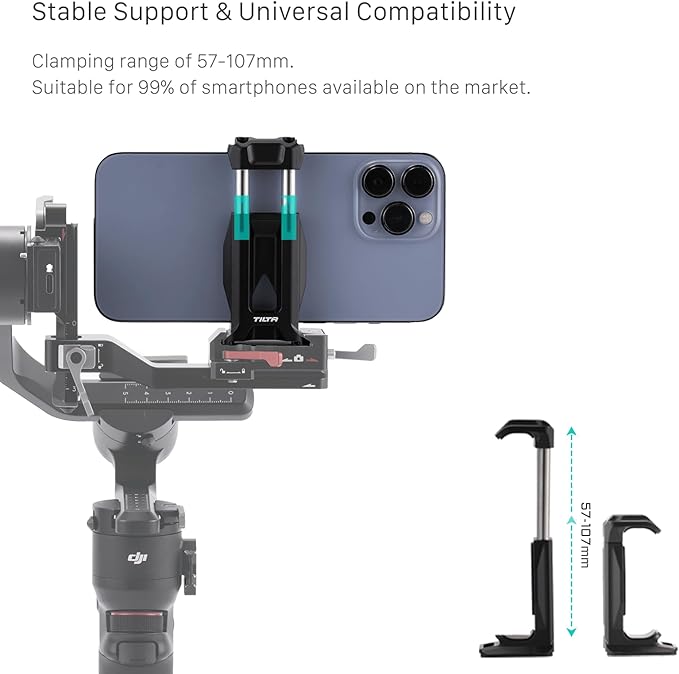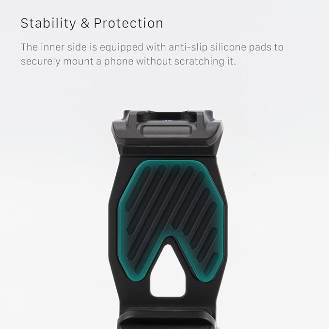このブラケットはユニバーサル クランプを介してスマートフォンに取り付けられ、底部の ARCA クイック リリース プレートを利用して、DJI RS3 Mini などの ARCA ベースのジンバルにシステムを簡単に取り付けることができます。