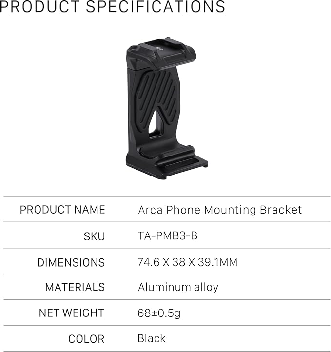 TILTA ARCAスマホマウントブラケット ARCAクイックリリースプレート付き ARCAベースのジンバルまたはサポートシステム用、コールドシューレシーバー付き軽量スマートフォンブラケット TA-PMB3-B
