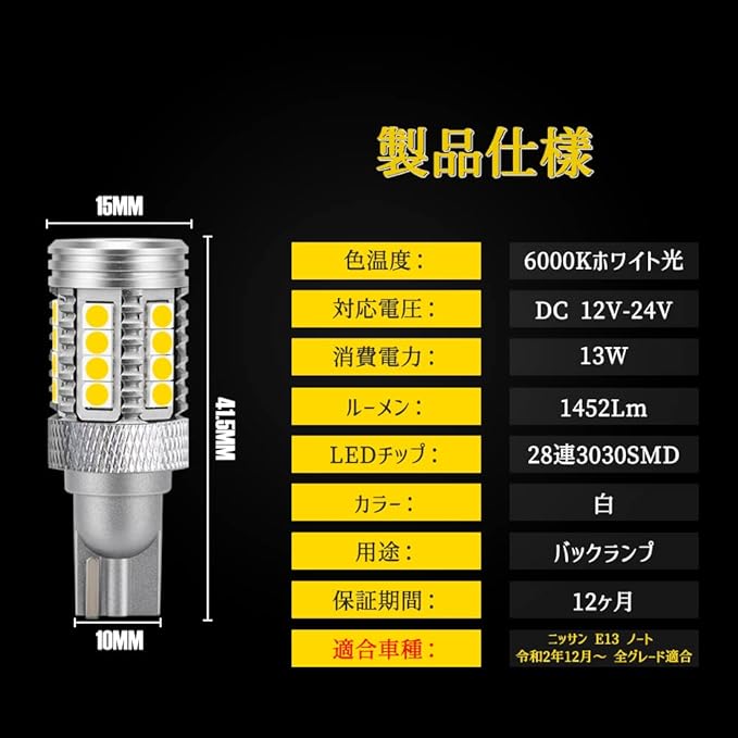 ニッサン E13 ノート適用/対応 綺麗LEDライト T16 バックランプ LED 後退灯 カスタム ドレスアップ パーツ 2個セット