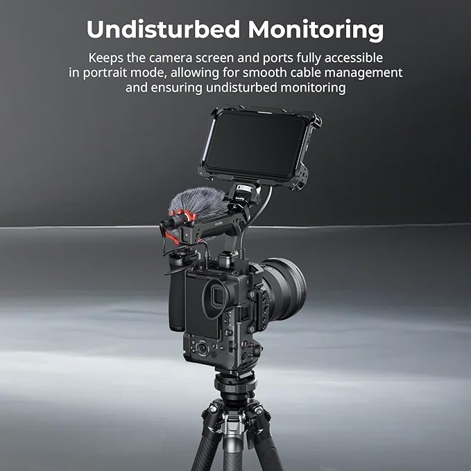 【邪魔されないモニタリング】ケージのグリップ側に取り付けると、プレートはポートレートモードでカメラの画面とポートに完全にアクセスできるようにし、スムーズなケーブル管理と邪魔されない監視を可能にします。