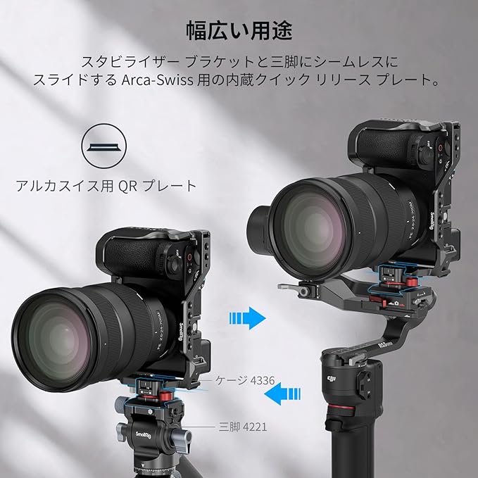 【Arca-Swiss用クイックリリースプレート】 Arca-Swiss用の統合クイックリリースプレートMD4857は、追加のアダプターなしでArcaタイプ三脚とスタビライザーに簡単に取り付けられます。DJI RS 2用 / RSC 2用 / RS 3用 / RS 3 Mini 用/ RS 3 Pro用スタビライザーと互換性があります。素早いセットアップと分解が可能です。