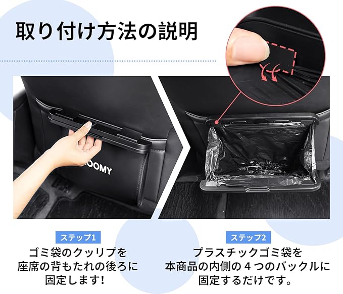 【多機能兼備・取り付け簡単】この車用ゴミ箱は小物収納機能も備えています。傘、鍵、タブレットなどを収納できます。さらに、ゴミ袋で覆われた部分は、シートの背面が蹴られて汚れるのを防ぎます。汚れても拭き取ればOK!それに、この車用レザーゴミ箱はフック式を採用してシート背面の収納バッグにバックルで留めるだけです。使わない時は持ち上げるだけで簡単に取り外せるので、とても便利です。