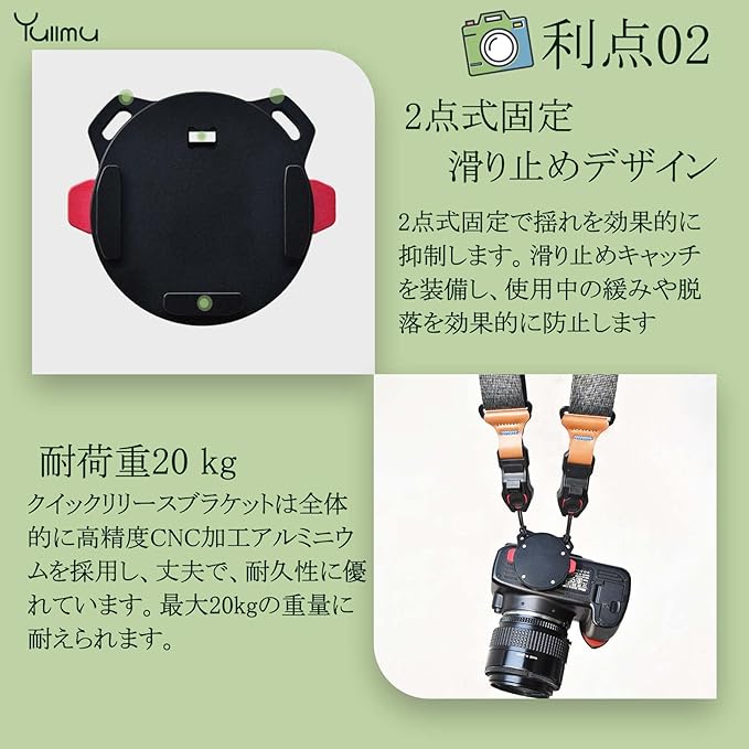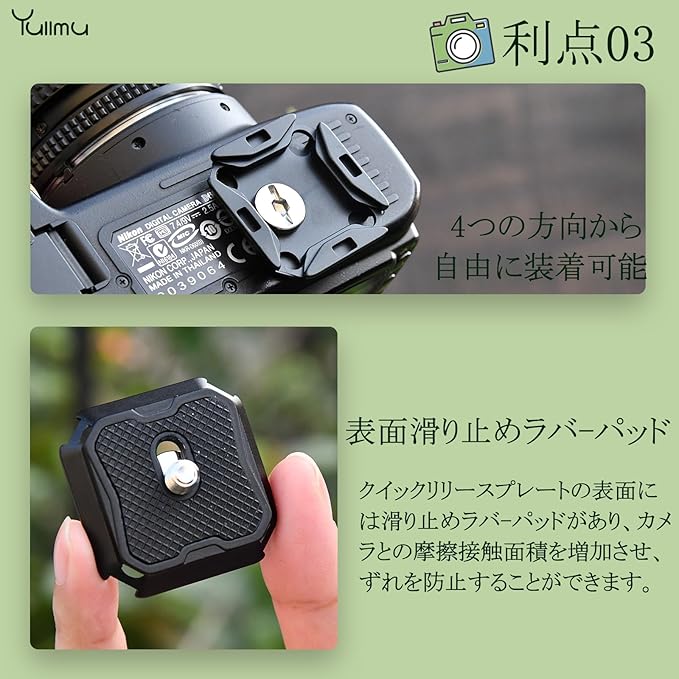 【滑り止め設計】クイックリリースクランプは2点式固定で揺れを効果的に抑制します。クイックリリースプレートの表面には滑り止めシリコンがあり、カメラとの摩擦接触面積を増加させ、ずれを防止することができます。