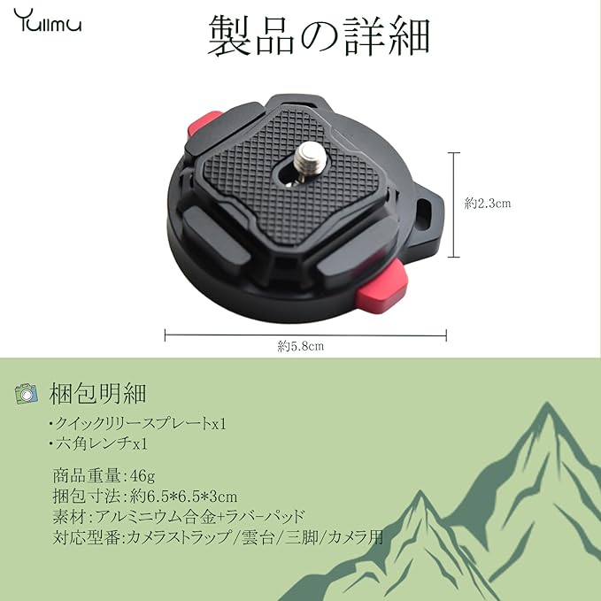 【製品仕様】約5.8*5.5*2.3cm、重さ約46g。耐荷重は20 kg。標準1/4ネジがあり、1/4接続穴付きの各機種カメラをすべて対応できます。 六角レンチが付きで取付が簡単です。