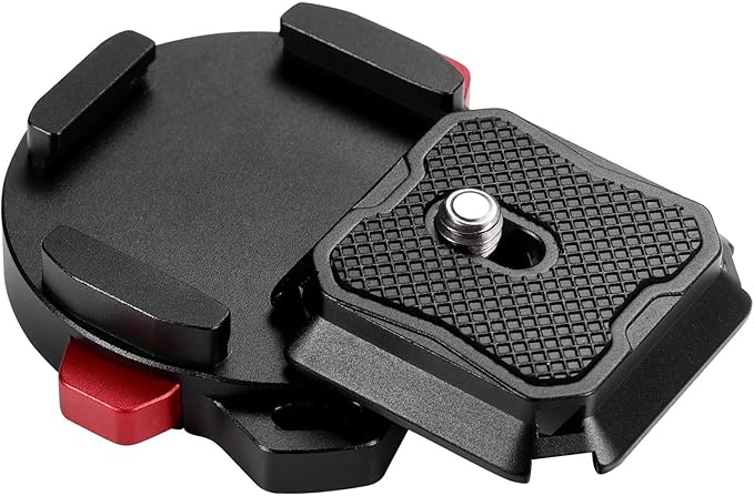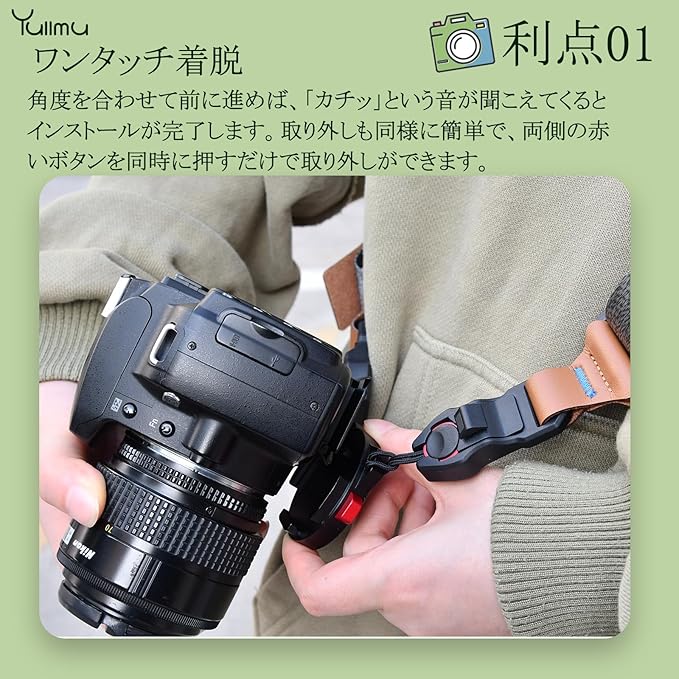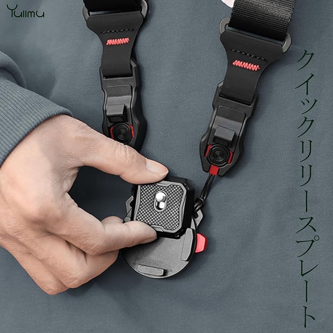 【ワンタッチ着脱】角度を合わせて前に進めば、「カチッ」という音が聞こえてくるとインストールが完了します。取り外しも同様に簡単で、両側の赤いボタンを同時に押すだけで取り外しができます。カメラと三脚、雲台、カメラストラップの間に素早く切り替えることができ、大量の着脱時間を節約でき、非常に便利です。