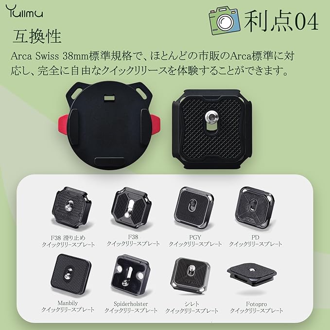【F38 アルカスイス互換】クイックリリースプレートとクイックリリースクランプはArca Swiss 38mm標準規格で、ほとんどの市販のArca標準に対応し、完全に自由なクイックリリースを体験することができます。