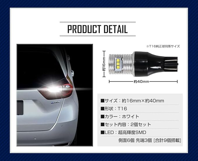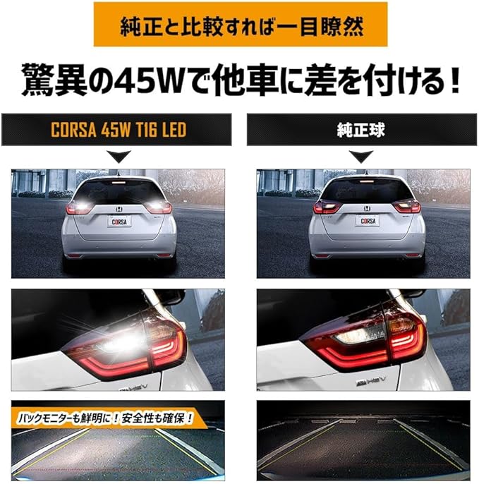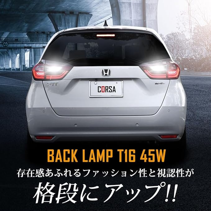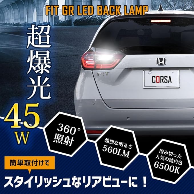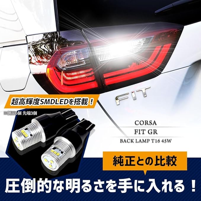 HONDA FIT GR 専用 T16 LEDバックランプ 45W 2個セット 【圧倒的な光量で後方視認性を向上】超爆光45W 560LM:超高輝度SMD LEDを9基(側面6個・先端3個)搭載。純正球を凌ぐ高い光量を実現。