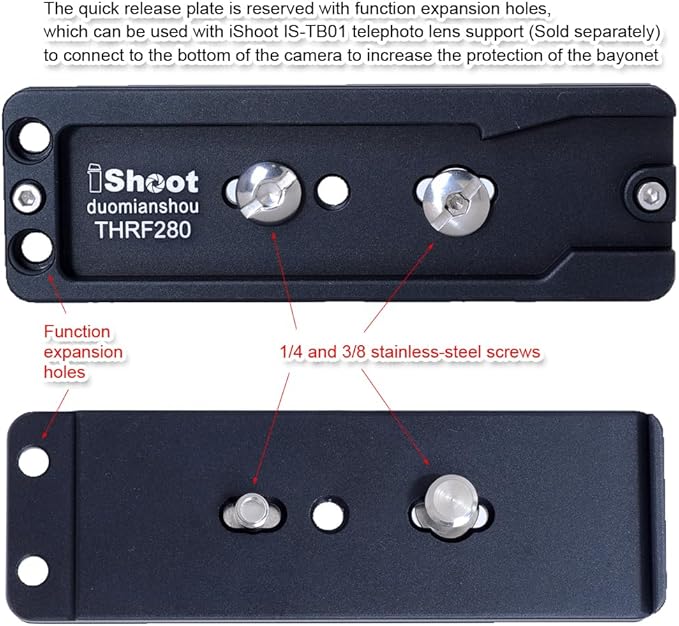 5. パッケージに含まれるもの: 1 x iShoot クイックリリースプレートIS-THRF280 (注:ここに記載されていない写真の他の項目は説明のみを目的としており、含まれていません)