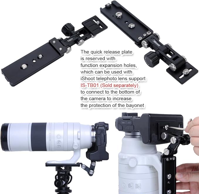 3. クイックリリースプレートには機能拡張穴が用意されており、iShoot IS-TB01望遠レンズサポート(別売)と併用してカメラの下部に接続し、バヨネットの保護を強化できます。