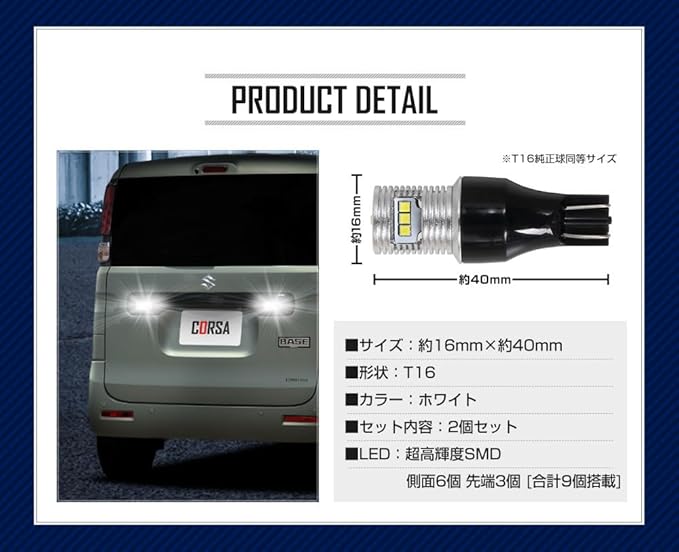 SUZUKI スペーシア ベース 専用 T16 LEDバックランプ 45W 2個セット 【圧倒的な光量で後方視認性を向上】超爆光45W 560LM:超高輝度SMD LEDを9基(側面6個・先端3個)搭載。純正球を凌ぐ高い光量を実現。