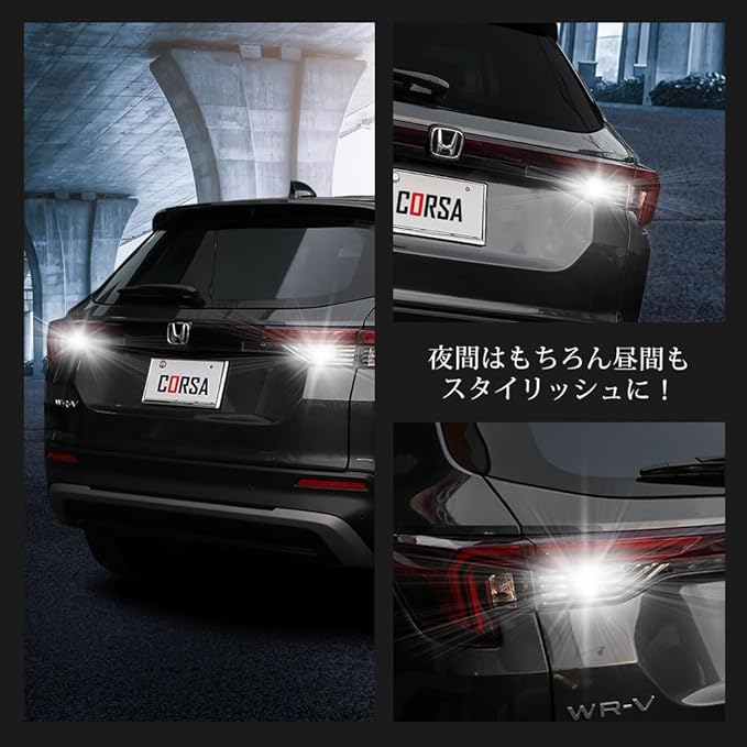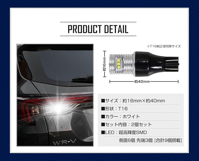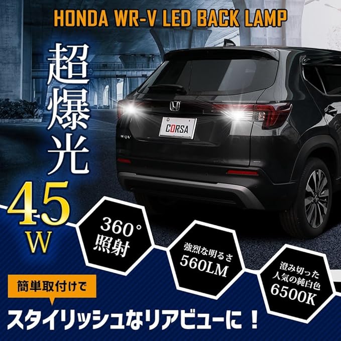 HONDA WR-V 専用 T16 LEDバックランプ 45W 2個セット 【圧倒的な光量で後方視認性を向上】超爆光45W 560LM:超高輝度SMD LEDを9基(側面6個・先端3個)搭載。純正球を凌ぐ高い光量を実現。