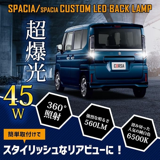 SUZUKI スペーシア スペーシアカスタム 専用 T16 LEDバックランプ 45W 2個セット 【圧倒的な光量で後方視認性を向上】超爆光45W 560LM:超高輝度SMD LEDを9基(側面6個・先端3個)搭載。純正球を凌ぐ高い光量を実現。