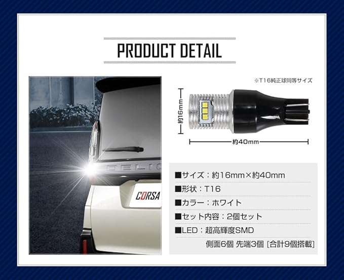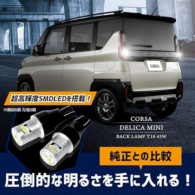 三菱 デリカミニ 専用 T16 LEDバックランプ 45W 2個セット 【圧倒的な光量で後方視認性を向上】超爆光45W 560LM:超高輝度SMD LEDを9基(側面6個・先端3個)搭載。純正球を凌ぐ高い光量を実現。