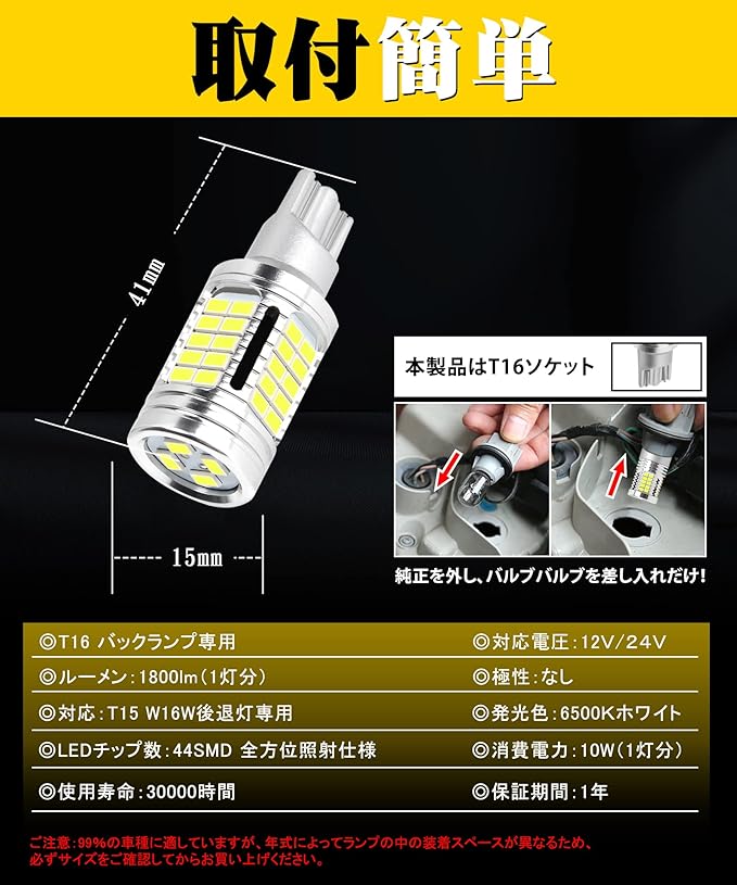 ■ソケット:T16 LED バックランプ専用(T16シングル| T15 W16W 純正交換用)■ルーメン実測値:1800lm(1灯分)■対応電圧:12v/24v(トラック適用)■発光色:6000kホワイト■消費電力:10W(1灯分)■極性:なし■適合性:日本車対応(ハイブリッド車 EV車対応)■長さ:ほぼ純正サイズ