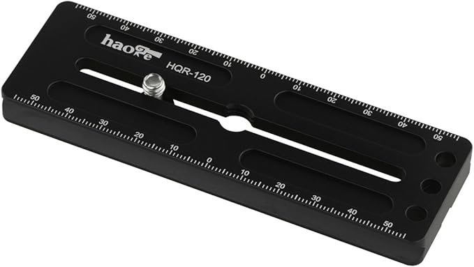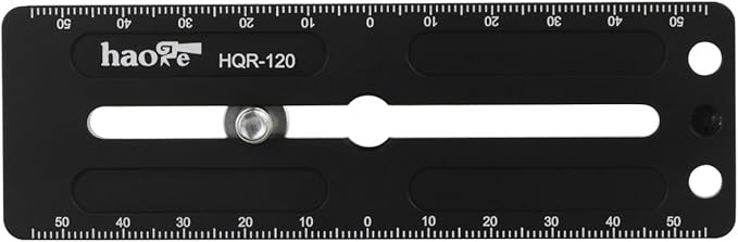 Haoge HQR-120ユニバーサルクイックリリースロングプレートは、アルカタイプ対応の多目的レールで、両側に1mm刻みでレーザー刻印された参照スケールが付いています。