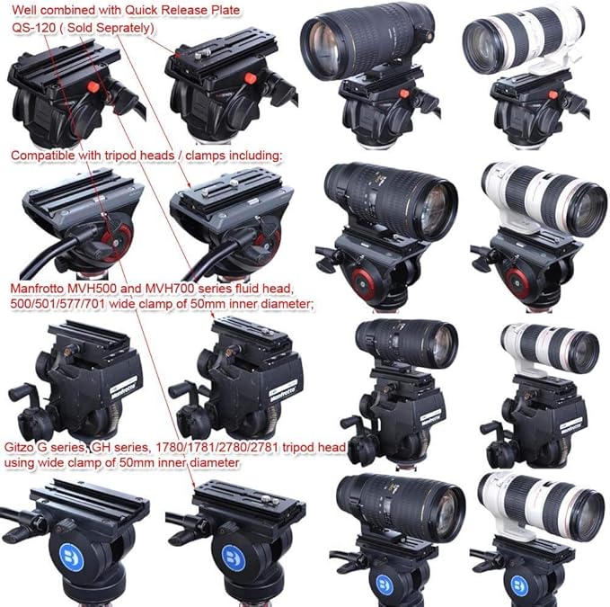 4. Manfrotto MVH500およびMVH700シリーズ流体ヘッドを含む三脚ヘッド/クランプ、内径50mmの500/501/577/701ワイドクランプと互換性があります。ジッツオGシリーズ、GHシリーズ、内径50mmのワイドクランプを使用した1780/1781/2780/2781三脚雲台。