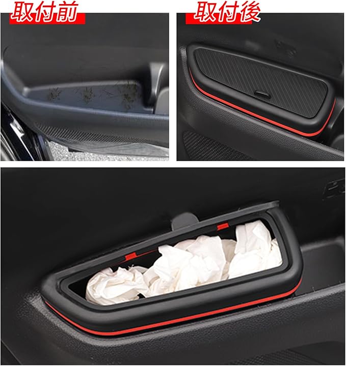 【収納便利・省ペース】:コンパクトな設計で、ティッシュや果皮などの小さなゴミをすぐに収納でき、車内を常にきれいに保ちます。また、別の用途として、クレジットカード、鍵、領収書などの小物を隠して収納することもでき、車内の整理に役立ちます。