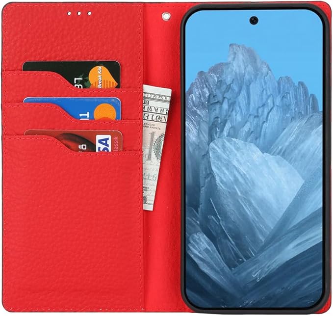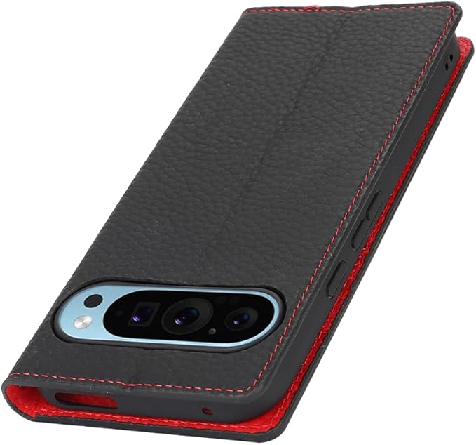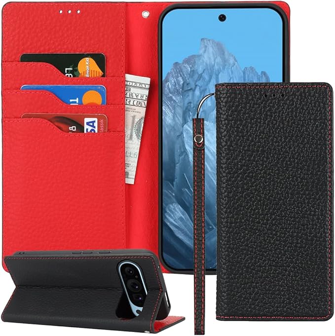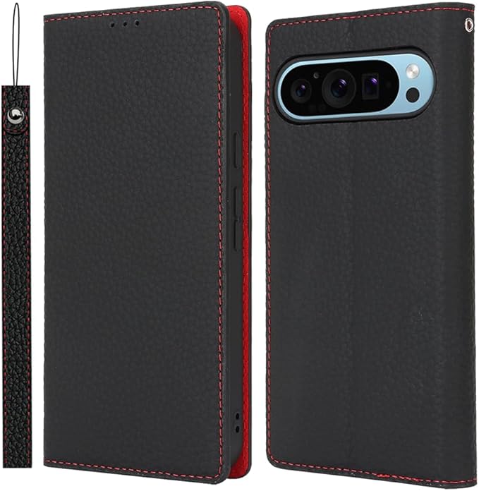 対応 Pixel9 pro xl ケース 手帳型 スマホケース グーグルピクセル9プロ XL カバー 手帳型 カードスロット、キックスタンド レイシ紋様本革レザー (ブラック)
