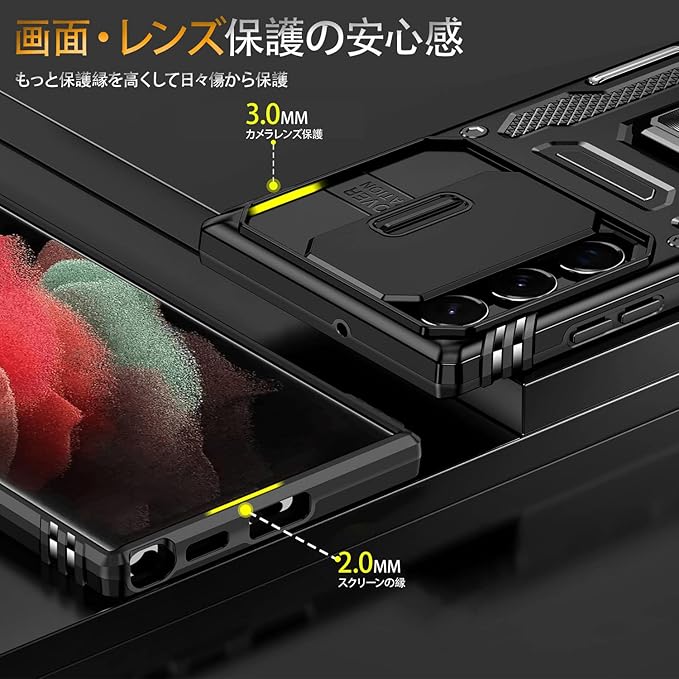 【スライド式カメラカバー】スライドカバーはより滑らかに開閉できるようになりました。カメラレンズもスライド式カバーで砂・埃などの侵入を防ぎます。ケースのエッジは液晶画面より高さの設計で、液晶画面を保護することができます。