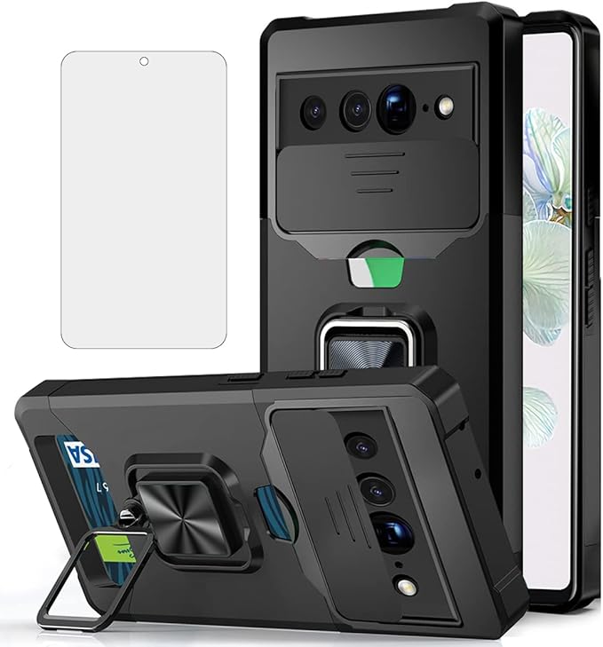 NKECXKJ Google Pixel 7 Pro 用ケース + 强化 ガラス フ フィルム 財布型カード収納 スマホケース 横置き機能リング スタンド 耐衝撃 Case Cover グーグルピクセル7 プロ ぐーくるぴくせる 7ぷろ 対応 背面 カバー レディース メンズ(ブラック)