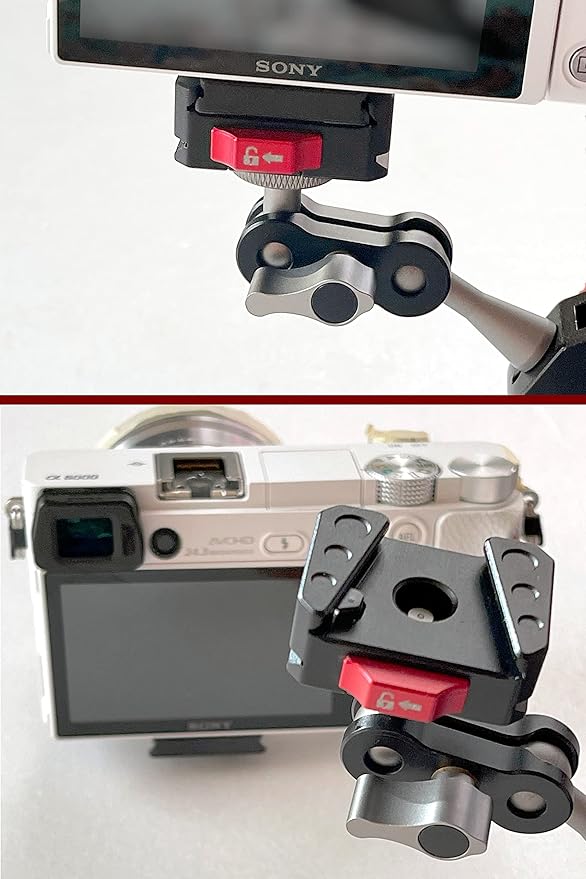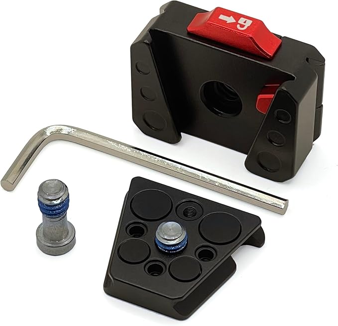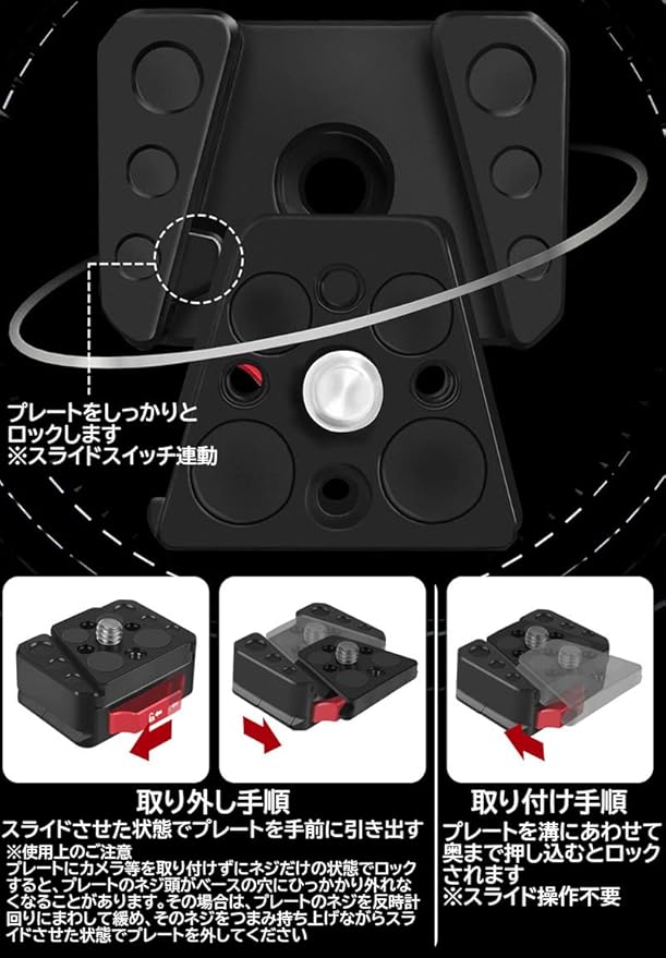※使用上のご注意:プレートにカメラ等をつけず(プレートに1/4ネジだけのまま)ベースに取り付けるとロックを解除してもプレートが外れなくなることがあります。この場合はプレートについている1/4ネジを反時計回りに何回か回して緩め、その1/4ネジを持ち上げながらロックを解除してプレートを撮りずしてください(原因:プレートのネジが緩んでいるとプレートのネジ頭がブレード側の穴に入って引っかかりプレートが動かなくなるため)
